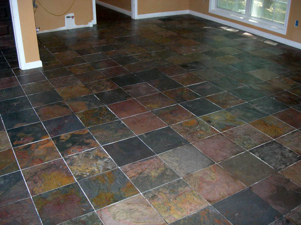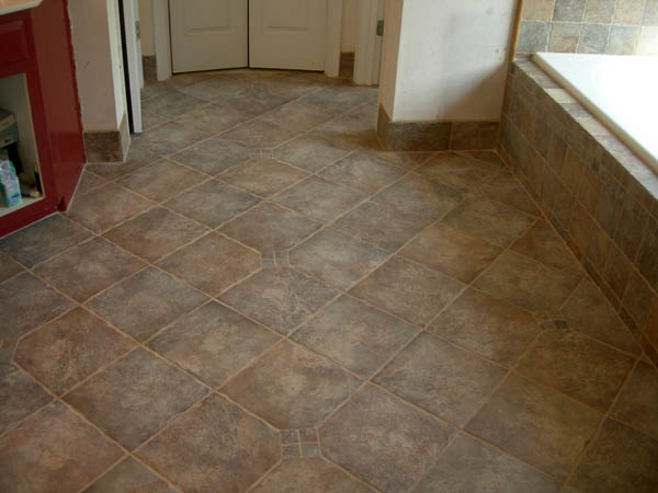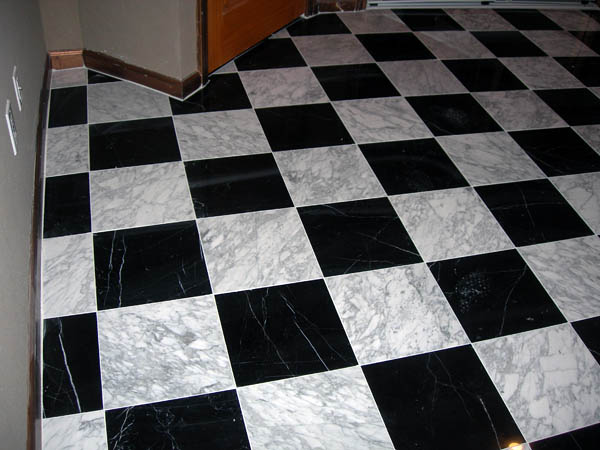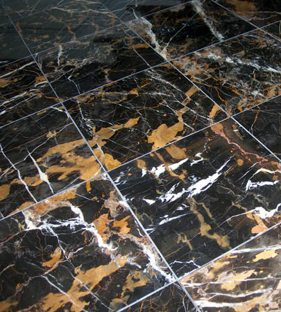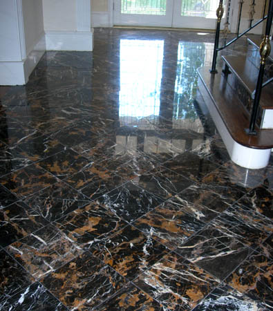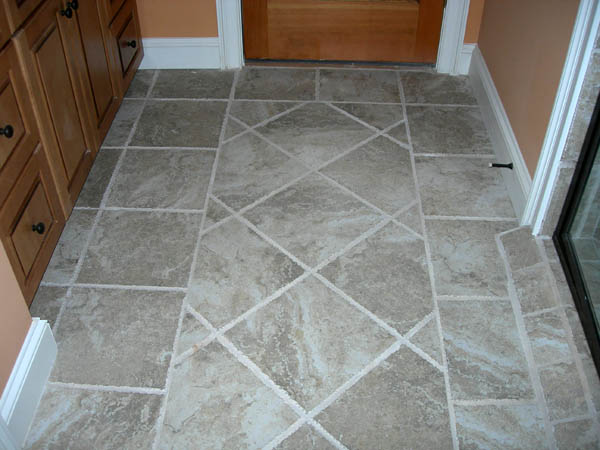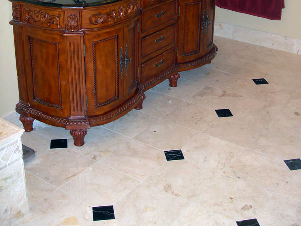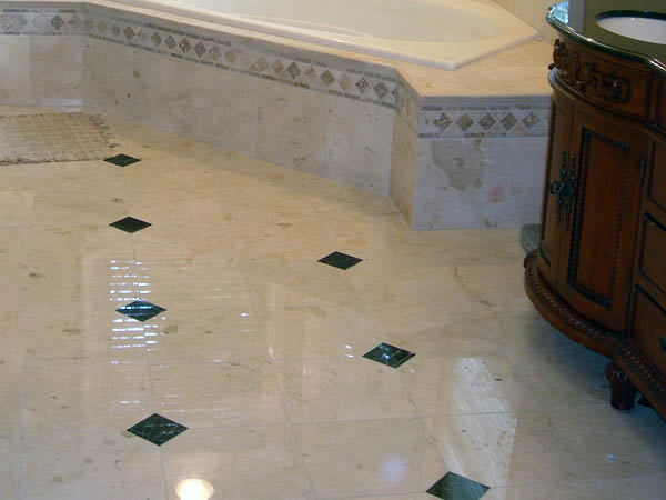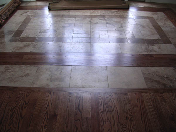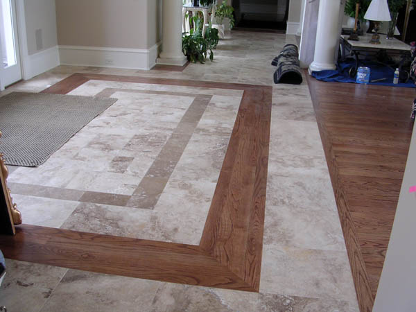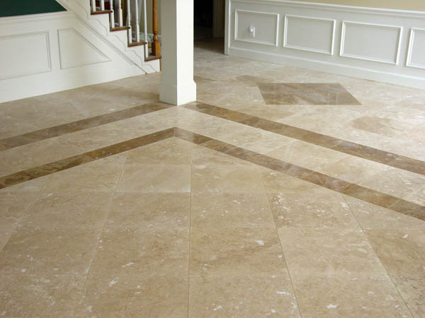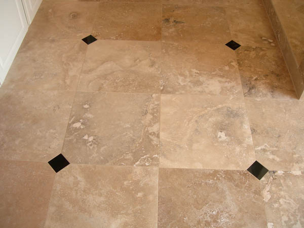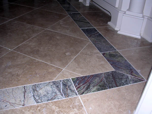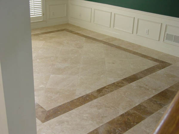 18"x18" travertine tiles with darker travertine border and diamond accents in the foyer